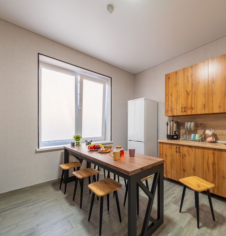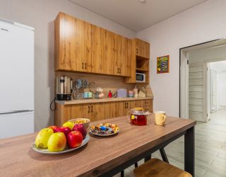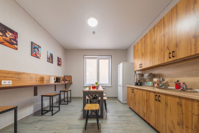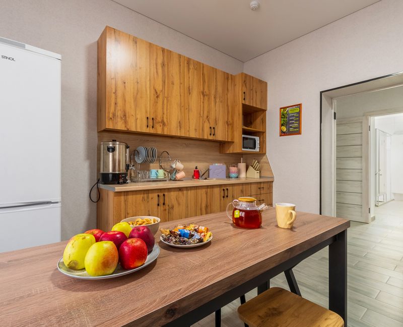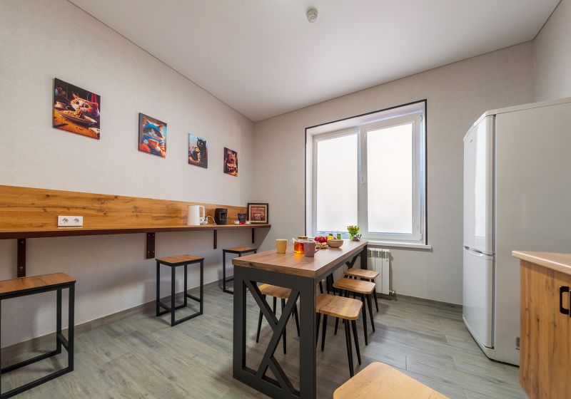 Кухня оборудована холодильником, микроволновой печью, электрическим чайником. В свободном доступе чай, сахар, хлопья каша быстрого приготовления. На территории хостела есть wi-fi.